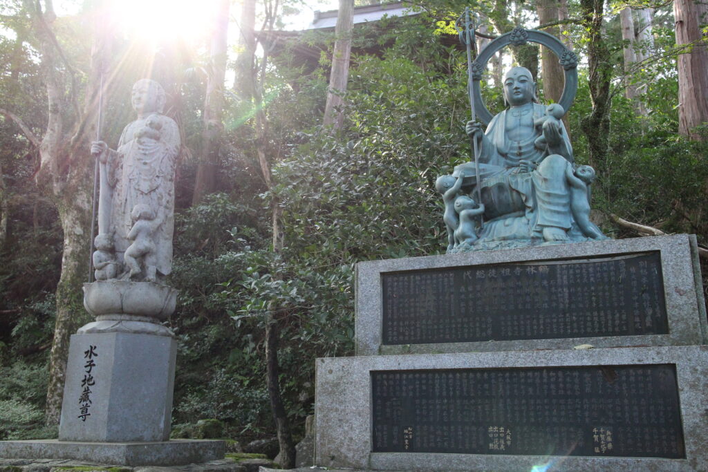 The last part of the mountain path to Kakurin-ji is paved with ancient flagstones and marked with cho-ishi, centuries-old trail markers that serve as vital clues to the history of the temple and the pilgrimage. Be sure to have a look at the guardian statues inside the temple gate—along with the usual hulking Nio guardians are two sensitively-carved cranes, memorials of the tale of the temple’s founding (see below). Inside the grounds you’ll find regal Japanese cedars hovering over a beautiful moss garden, along with a number of stone and metal statues of Kobo Daishi and the bodhisattva Jizo, the main deity of the temple. Turning right and heading up a long stone staircase takes you to the main hall. The more you look, the more cranes you’ll notice—a pair of metal statues stand watch in front of the hall, and the temple’s unusual crest, a circular crane motif, adorns the roof, candle-stand, and more. To the left of the main hall past a serene statue of Jizo is the temple’s three-story pagoda, covered in rich carvings of gargoyle-like guardians, angelic beings, and other mythical figures. A trail along the hill behind the pagoda takes you back toward the main hall, passing by several small chapels and monuments on the way. Heading back down the staircase takes you to the Daishi Hall and Temple Office. The trail to Temple 21, Tairyu-ji, starts next to the hand-washing basin, and descends about 500 meters before the steep ascent to Tairyu-ji.