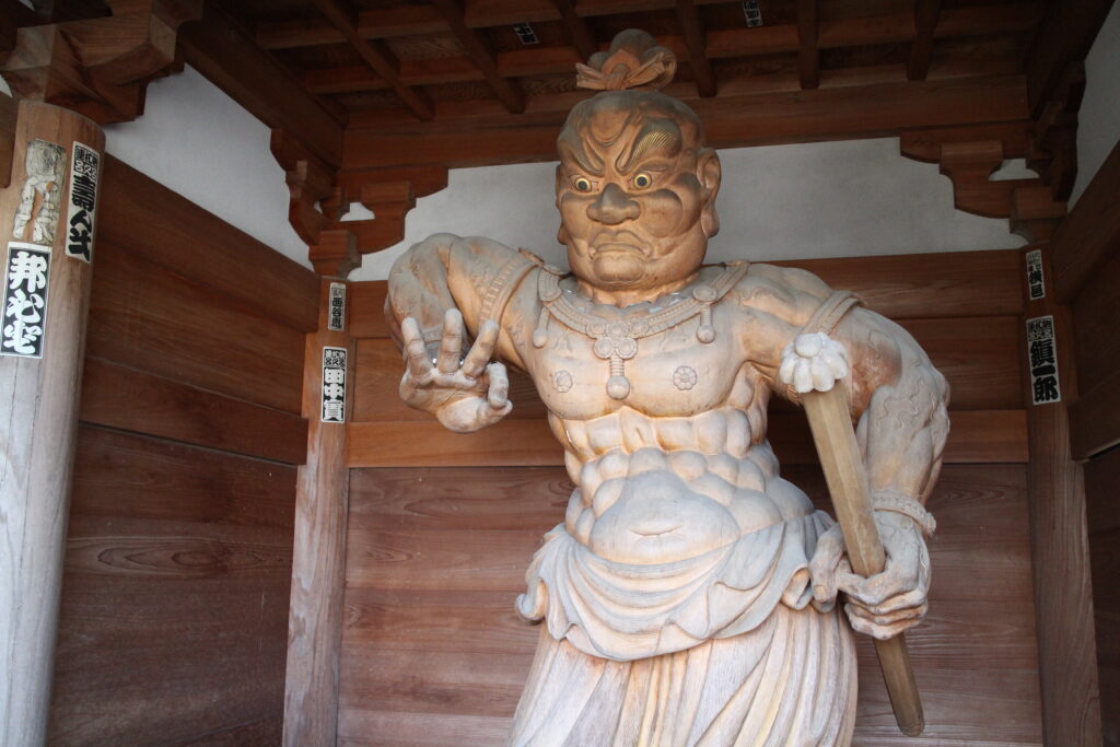 Anraku-ji lies tucked away in a village in the Yoshino River Valley. Its gate is guarded by sensitively-carved sculptures crafted by the renowned contemporary Buddhist sculptor Matsumoto Myokei, whose distinctive works are spread throughout the temple. Passing through the gate, a long courtyard flanked by a gorgeous pagoda surrounded by a garden on the left, and the shukubo (temple accommodation) on the right, leads up to the main hall. While the carvings on the eaves of the temple may look traditional at a glance, these recent carvings illustrate the story of the Shikoku Pilgrimage, from the birth of Kukai right up to modern modes of transportation. The interior of the temple is richly decorated with painted columns and carvings. Visitors who stay in the temple’s shukubo have the opportunity to participate in a moving Buddhist ceremony after dinner, during which they can see, and even touch, the many amazing works of religious art that make Anraku-ji a must-visit stop for pilgrims and tourists alike.Discover more about the history and tradition of shukubo (temple lodging) at Japan Guide’s page on Temple Lodging.